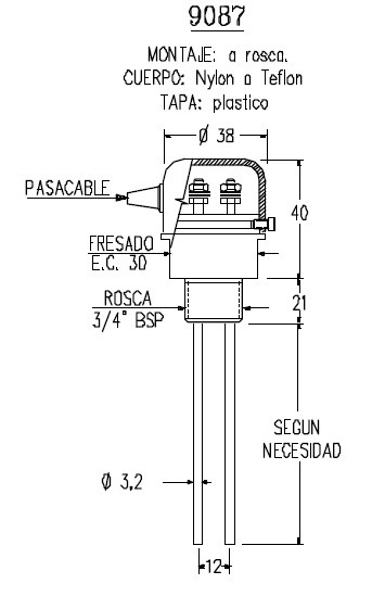 Electrodo 2 varillas de 2m de largo, cuerpo roscado de Nylon 3/4" BSP codigo 9087. Para detección de nivel por conductividad. (alto vacío)