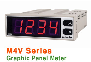 Indicador digital escalable marca Autonics modelo M4V de 75x26 mm, 4 dígitos de 7 segmentos a LED de 14 mm de altura, entrada 0...2 Vdc, 1...5 Vdc, 0...10 Vdc, 0...1 mA y 4...20 mA, rango escalable -999...+9999 unidades, alimentación 12...24 Vcc y demás características según hojas técnicas adjuntas