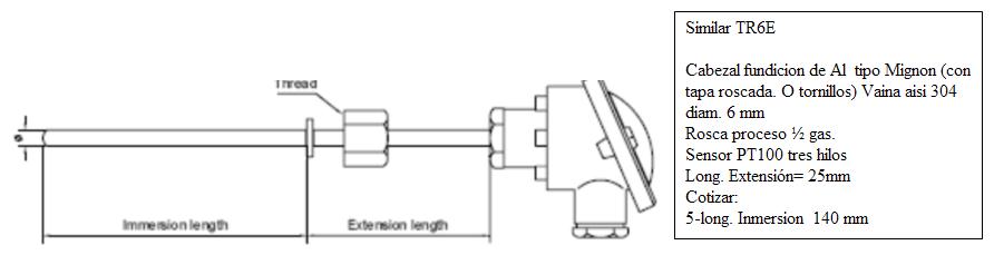 Sensor Pt100 de 3 hilos, con vaina de diam.6 mm, longitud 140 mm,con extensión de 25 mm, material vaina AISI 304, con conexión a proceso rosca diam. 1/2" gas, cabezal de aluminio DINC estanco, con tapa roscada.