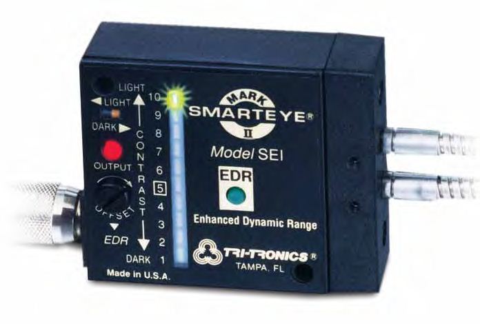 Sensor fotoeléctrico infrarrojo para fibra óptica marca TRITRONICS Mod. SEIK-F1, sensibilidad ajustable mediante perilla, salida NPN y PNP a colector abierto, NA/NC seleccionable, alimentación 12/24 VCC