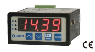 Indicador de proceso marca SIMEX modelo SRT 73 1311 1 3 001, tamaño 72x36x97mm, alimentación 24V AC/DC, valores del display 999 a 9999 + punto decimal, protección IP65, entrada configurable en Corriente y Voltaje, salida a rele de 1 amp. y demás características según hojas técnicas adjuntas