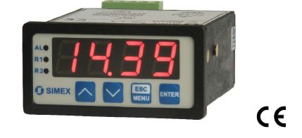 Indicador de temperatura marca SIMEX modelo SRT 73 1311 1 3 001, tamaño 72x36x97mm, alimentación 24V AC/DC, rango de medición 100ºC a 600ºC, protección IP65, entrada configurable (PT100, PT500, PT1000)