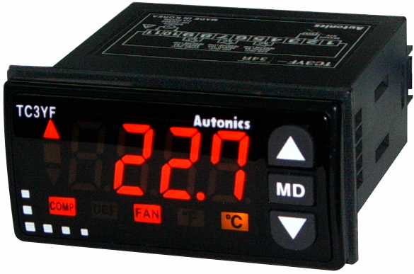 Controlador de temperatura para refrigeración con sensor de temperatura incluido, marca AUTONICS CORP. modelo TC3YF-14R, de 72 x 36 x 84mm, 3 dÃgitos, con sensor NTC, 1 salida a relé, alimentación 100/240 Vca y demás caracterÃsticas según hojas técnicas adjuntas